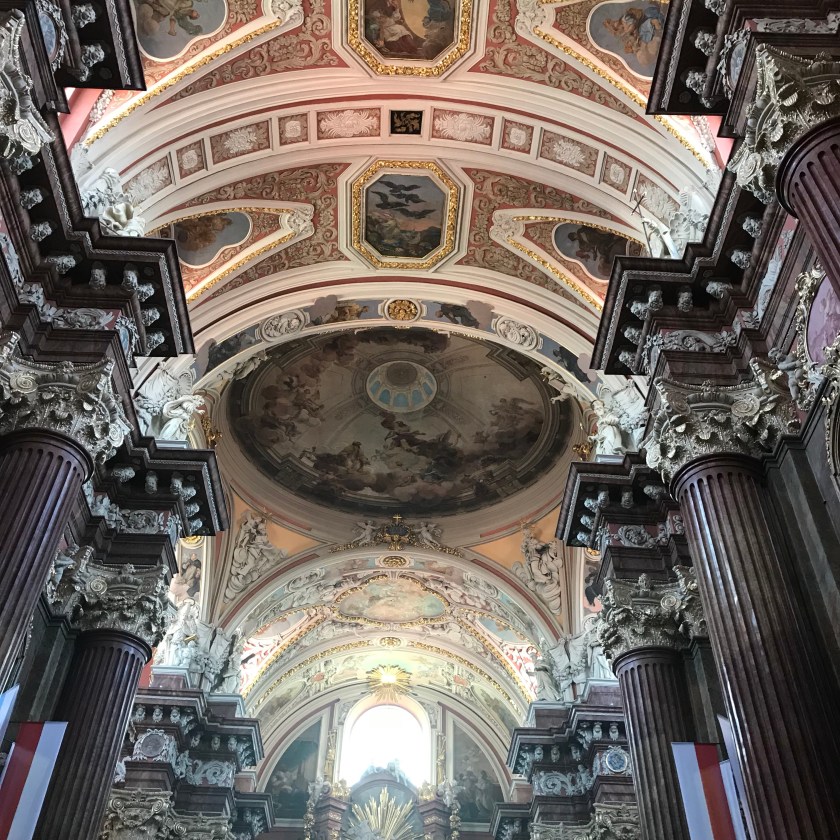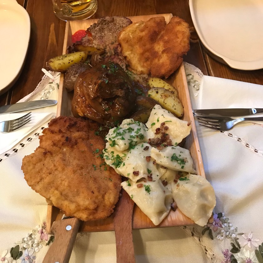 Wandering the city, following the old city walls, passing a palace and a church or two, the combination of the heat (33 degrees) and my growing cold sapped most of my energy. Leaving Dana & Liz with the assignment of finding a good place for dinner we returned to our apartment to rest up. Meeting up with the Johnston’s later they lead us to a small local restaurant down an alley from the main square. It was charming and authentic. Liz & Dana ordered the plate for two. I obviously don’t understand Polish math as this plate would have fed six.