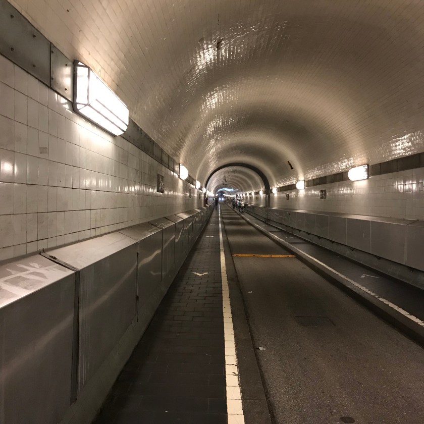 Disembarking, Liz had read about the Elbe pedestrian tunnel, which was located close by. Descending into the depths we walked the tunnel and, for the first time in days, felt cool.