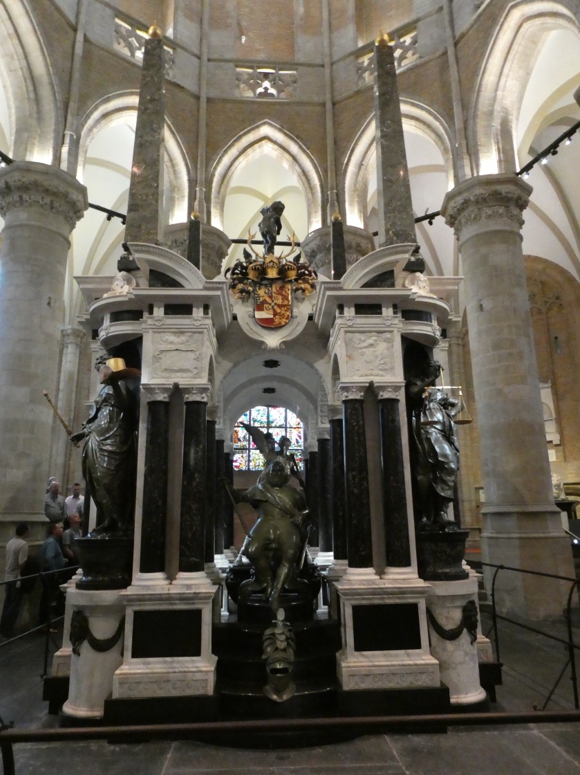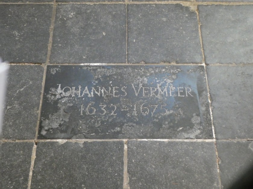 We wandered until 10 o’clock when the Oude Kerk (Old Church) opened. Construction was started in the early 1200s and as it was only built when money was available so it took 400 years to complete. The first thing you notice on entering is how plain and austere the interior is in comparison to many of the bling encrusted churches we’ve seen elsewhere. The Old Church is noteworthy as the final resting place of local boy Johannes Vanmeer (the painter). When he died he was living in near-poverty so to save money they buried him standing up. Later, when the locals realized how important he was they dug him up and reburied him properly.